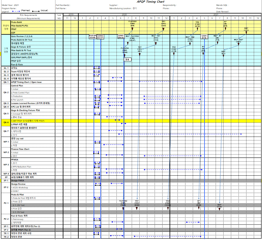 개발계획은 APQP Timing Chart를 사용하여 수립하게 됩니다.